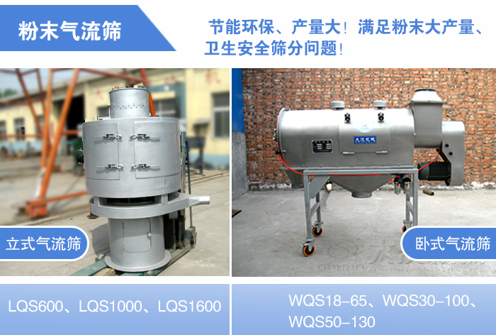 粉末氣流篩有立式和臥式兩種,立式氣流篩的型號有:LQS600、LQS1000、LQS1600;臥式氣流篩的型號有:WQS18-65、WQS30-100、WQS50-130,用材質有不銹鋼和碳鋼(可根據(jù)用戶的要求特殊定制)
