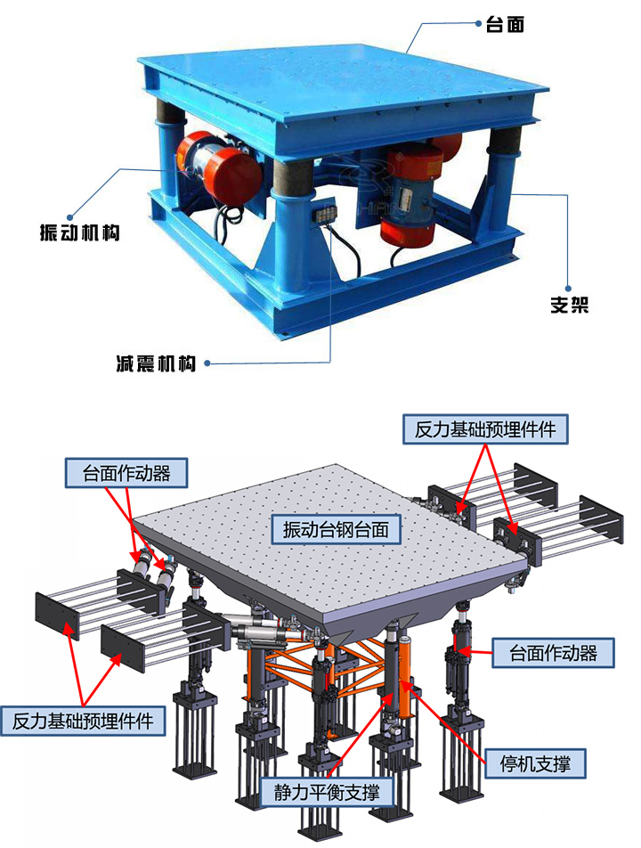 振動平臺主要有支架、臺面、振動機構,減震機構四部分組成。